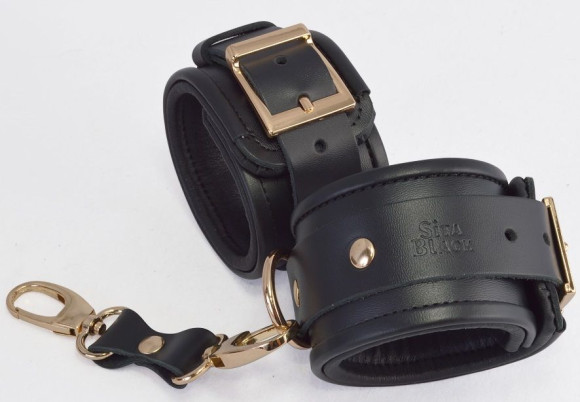 Черные кожаные наручники с золотистыми пряжками и карабином