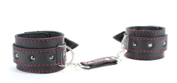 Оковы выполнены из черной натуральной кожи с красной контрастной строчкой. На ремнях украшение в виде металлических шипов. Оковы надежно фиксируются пряжками и ремнями, позволяющими выбрать нужный размер, подойдут на обхват от 18 до 27 см. Кожаное соединение на карабинах фиксирует оковы вместе. Аксессуар позволяет в полной мере насладиться сексом в стиле БДСМ. Ширина - 5 см.