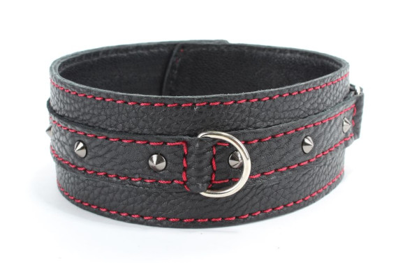 Ошейник выполнен из качественной натуральной кожи, мягкий и комфортный в использовании. Декорирован шипами и яркой красной строчкой. Ремень сзади позволяет выбрать нужный размер, подойдет на обхват от 30 до 40 см. Металлическая пряжка надежно фиксирует аксессуар. Подклад выполнен из нежной перчаточной кожи. Стильный ошейник поможет воплотить эротические фантазии в реальность. Ширина - 5 см.